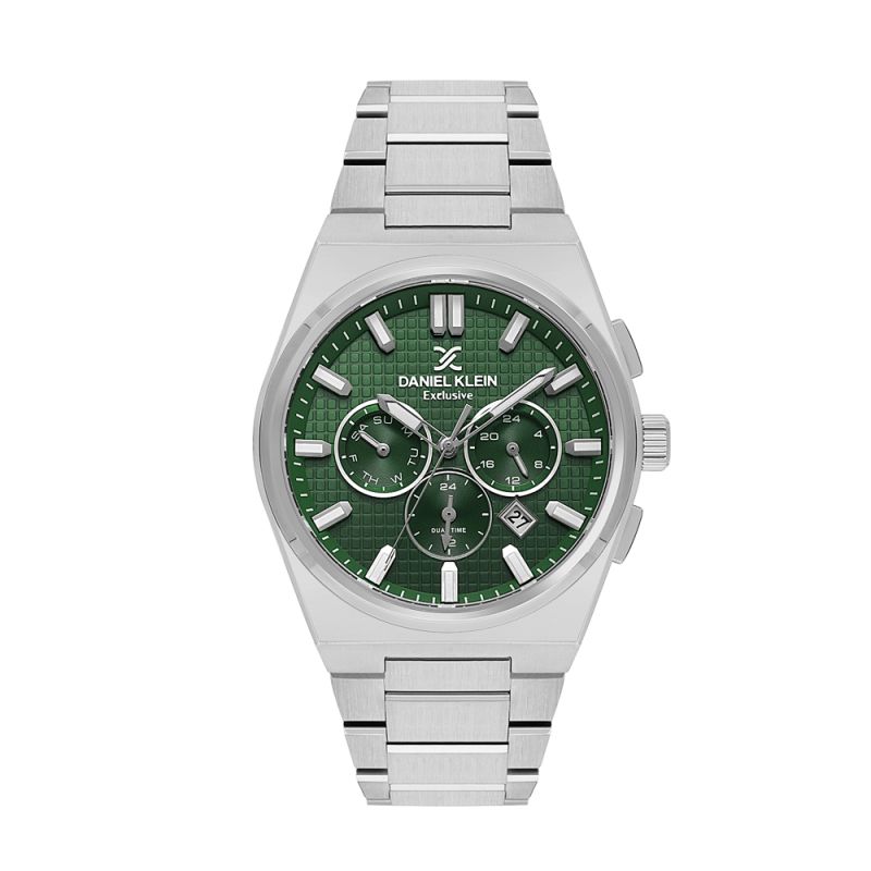 Мъжки часовник Daniel Klein със спортно-елегантен дизайн от колекцията Exclusive. Моделът е с метален корпус и верижка от неръждаема стомана. Диаметър на корпуса 44 мм. Мултифункционален дисплей с показатели за дата, ден от седмицата и двойно време. Стъкло минерал-кристал. Часовникът се задвижва от кварцов механизъм JP25-4.5. Водоустойчивост 5 ATM - допускат се леки пръски и взимане на душ, не се препоръчва обилно мокрене.