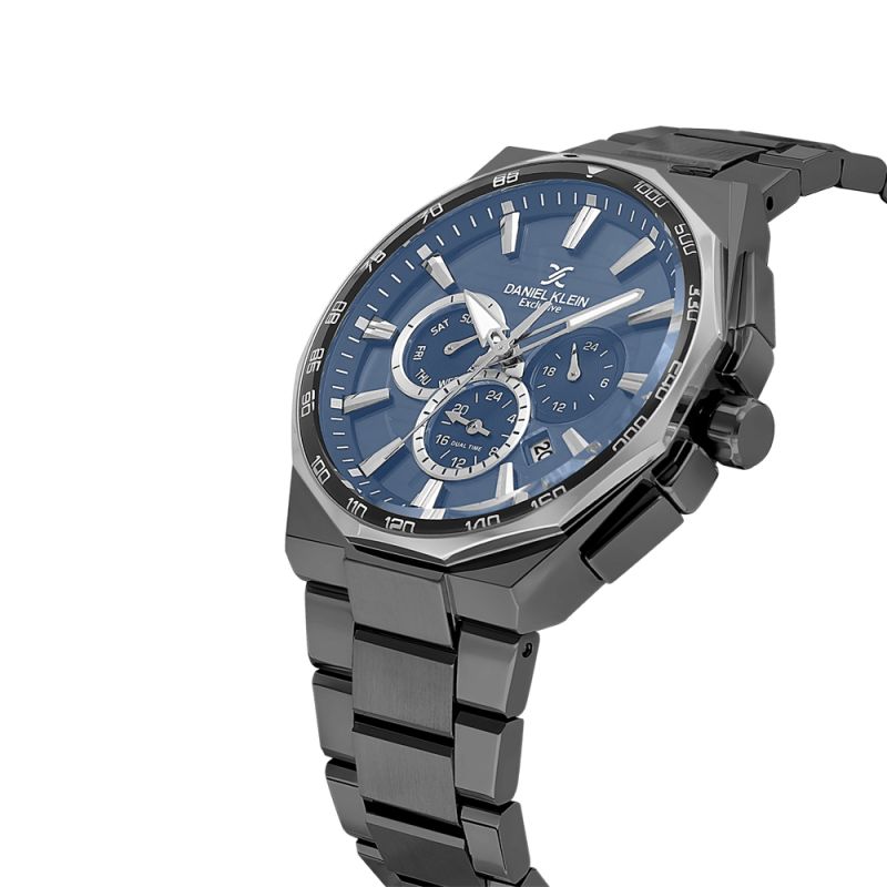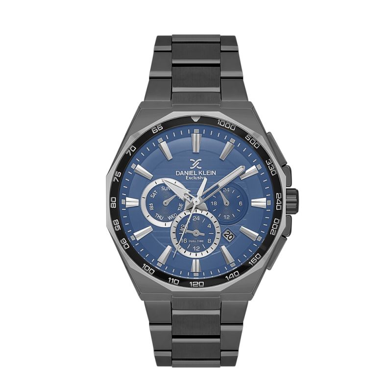 Мъжки часовник Daniel Klein със спортно-елегантен дизайн от колекцията Exclusive. Моделът е с метален корпус и верижка от неръждаема стомана. Диаметър на корпуса 44.5 мм. Мултифункционален дисплей с показатели за дата, ден от седмицата и двойно време. Стъкло минерал-кристал. Часовникът се задвижва от кварцов механизъм JP25-4.5. Водоустойчивост 5 ATM - допускат се леки пръски и взимане на душ, не се препоръчва обилно мокрене.