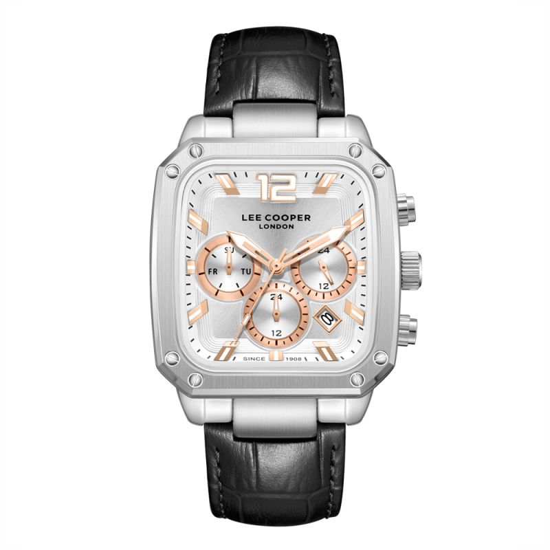Мъжки часовник Lee Cooper със спортно-елегантен дизайн. Сребрист мултифункционален дисплей с детайли в цвят розово злато. Стъкло минерал-кристал. Корпус изработен от супер метал - специална сплав, създадена от марката. Черна каишка от естествена кожа. Задвижва се от кварцов механизъм. Водоустойчивост 3 ATM - допускат се леки пръски, не се препоръчва обилно мокрене.