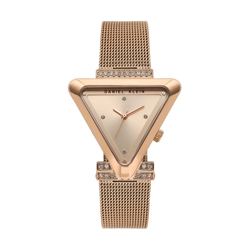 Впечатляващ дамски часовник Daniel Klein с елегантна визия в цвят розово злато от колекцията Premium. Моделът е с декорация от инкрустирани кристали от две страни на корпуса, при свързването с верижката и по циферблата. Дисплеят е аналогов със стилен дизайн. Стъклото е минерал-кристал. Часовникът е с метален корпус и меш верижка от неръждаема стомана. Задвижва се от кварцов механизъм 2035. Водоустойчивост 3 ATM - допускат се леки пръски, не се препоръчва обилно мокрене.