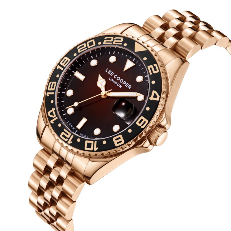 Мъжки часовник Lee Cooper със спортно-елегантна визия. Аналогов дисплей с показател за дата. Луминесцентно покритие върху стрелките и индексите. Стъкло минерал-кристал. Корпус от супер метал - специална сплав, създадена от марката. Верижка от неръждаема стомана в цвят розово злато. Задвижва се от кварцов механизъм. Водоустойчивост 5 ATM - допускат се леки пръски и взимане на душ, не се препоръчва обилно мокрене.