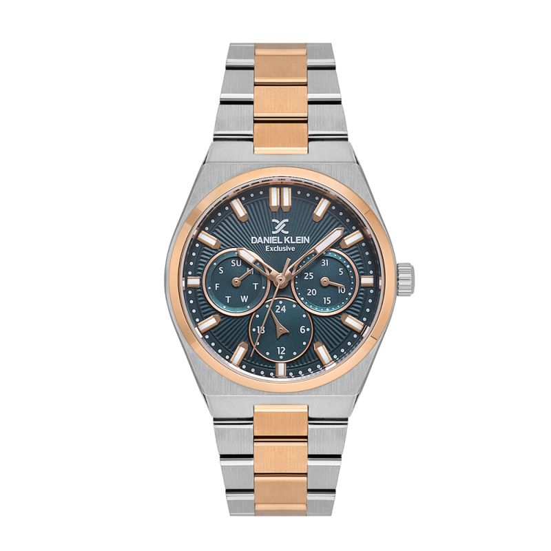 Дамски часовник Daniel Klein със спортно-ежедневна визия от колекцията Exclusive. Моделът е с мултифункционален дисплей с показатели за дата, ден от седмицата и 24 часов формат. Корпусът е изработен от метал. Верижката е от неръждаема стомана. Стъклото е минерал-кристал. Часовникът се задвижва от кварцов механизъм VX3JE1. Водоустойчивост 3 ATM - допускат се леки пръски, не се препоръчва обилно мокрене.