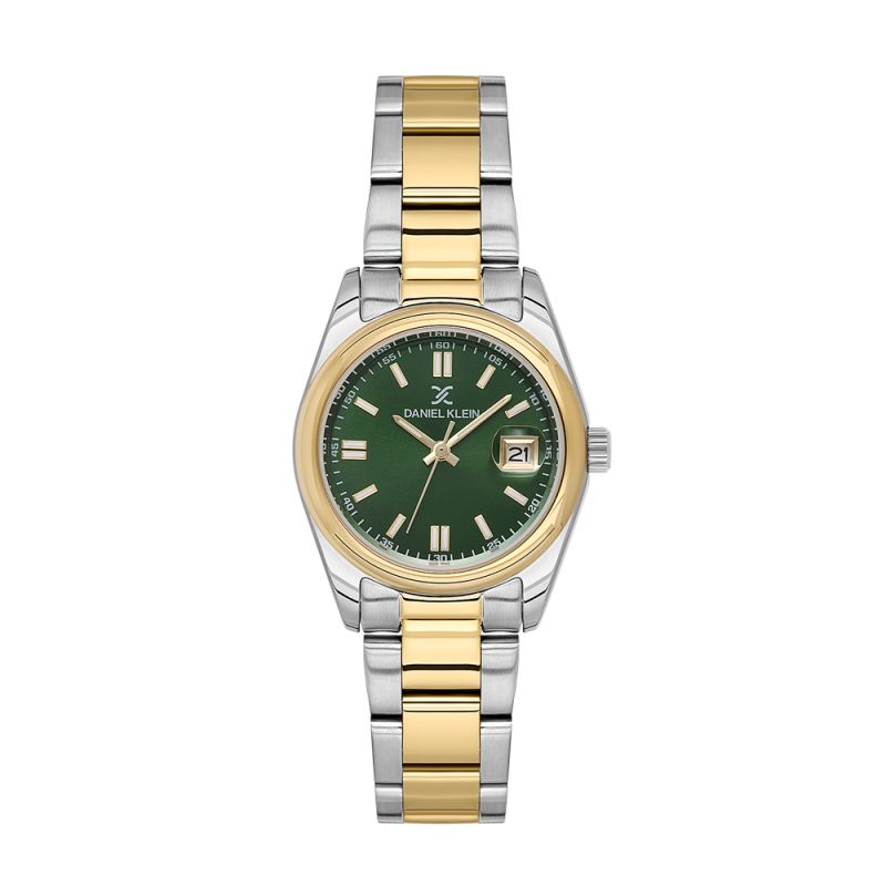 Класически модел дамски часовник Daniel Klein от колекцията Premium. Корпус изработен от метал в комбинация с верижка от неръждаема стомана. Диаметър на корпуса 30 мм. Тъмнозелен аналогов дисплей с показател за дата. Луминисцентно покритие върху стрелките и индексите. Стъкло минерал-кристал. Задвижва се от кварцов механизъм VX12E11. Водоустойчивост 3 ATM - допускат се леки пръски, не се препоръчва обилно мокрене.