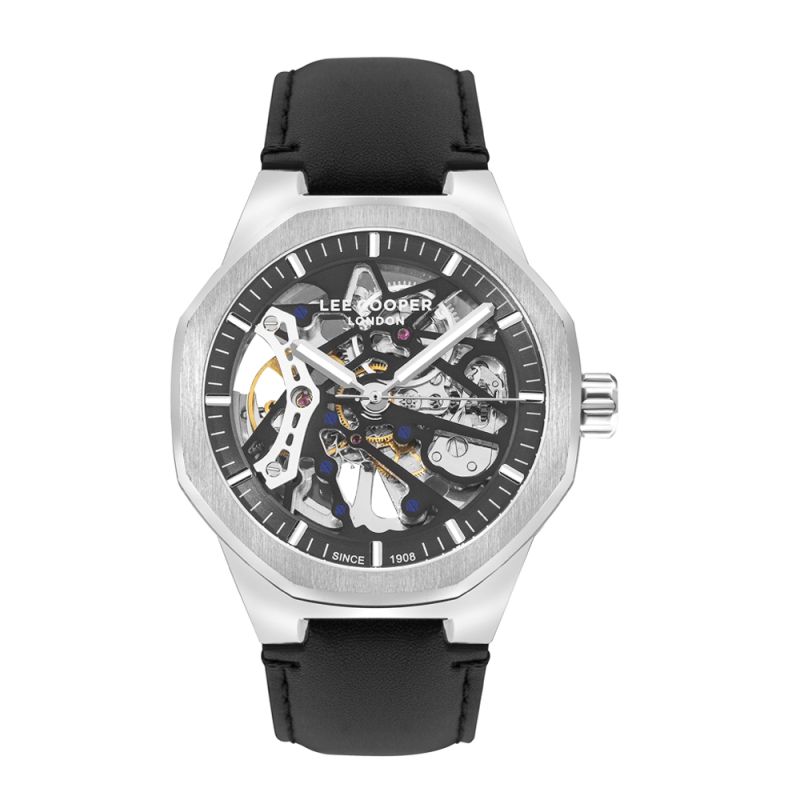 Мъжки часовник Lee Cooper с модерен впечатляващ дизайн. Моделът е с дисплей тип скелетен, през който може да се види автоматичния механизъм калибър G3265. Стъклото е минерал-кристал. Корпусът е изработен от супер метал и е в комбинация с каишка от естествена кожа. Диаметър на корпуса 43 мм. Водоустойчивост 5 ATM - допускат се леки пръски и взимане на душ, не се препоръчва обилно мокрене.