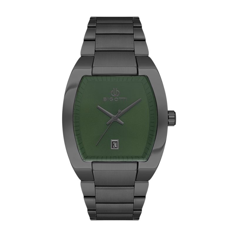 Спортно-елегантен мъжки часовник Bigotti от колекцията Raffinato. Корпусът е изработен от месинг. Верижката е от неръждаема стомана. Дисплеят е аналогов в тъмнозелен цвят със сиви акценти и с показател за дата. Стъклото е минерал-кристал. Задвижва се от кварцов механизъм калибър VX42E12S. Водоустойчивост 5 ATM - допускат се леки пръски и взимане на душ, не се препоръчва обилно мокрене.