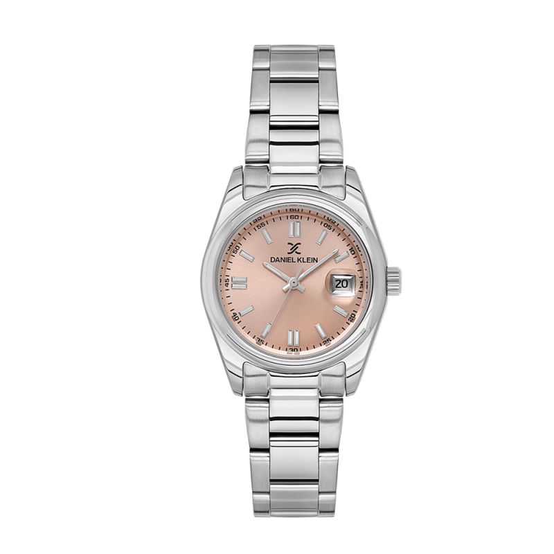 Класически модел дамски часовник Daniel Klein от колекцията Premium. Корпус изработен от метал в комбинация с верижка от неръждаема стомана. Диаметър на корпуса 30 мм. Аналогов дисплей в нежен розов цвят с показател за дата. Луминисцентно покритие върху стрелките и индексите. Стъкло минерал-кристал. Задвижва се от кварцов механизъм VX12E11. Водоустойчивост 3 ATM - допускат се леки пръски, не се препоръчва обилно мокрене.