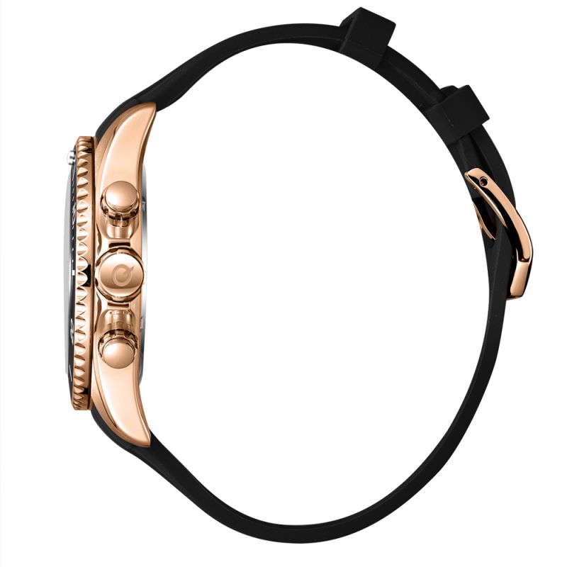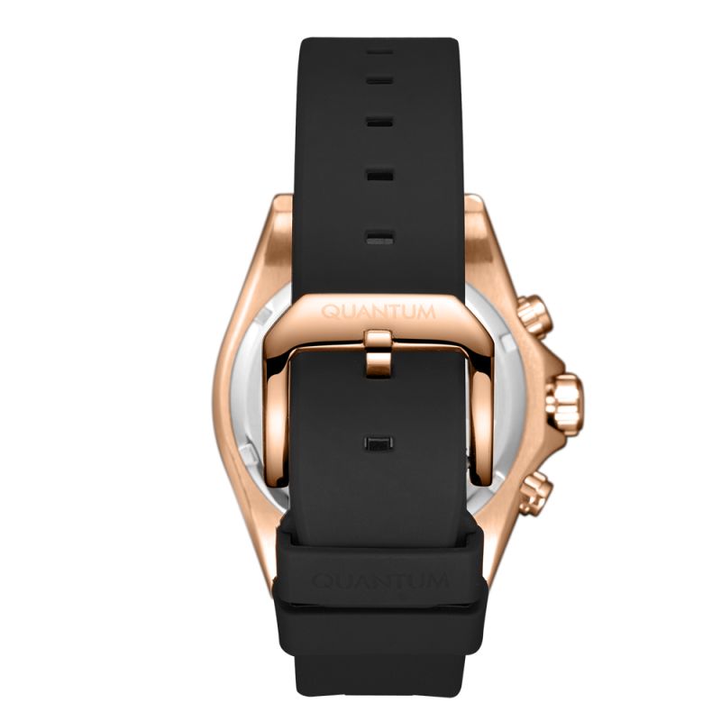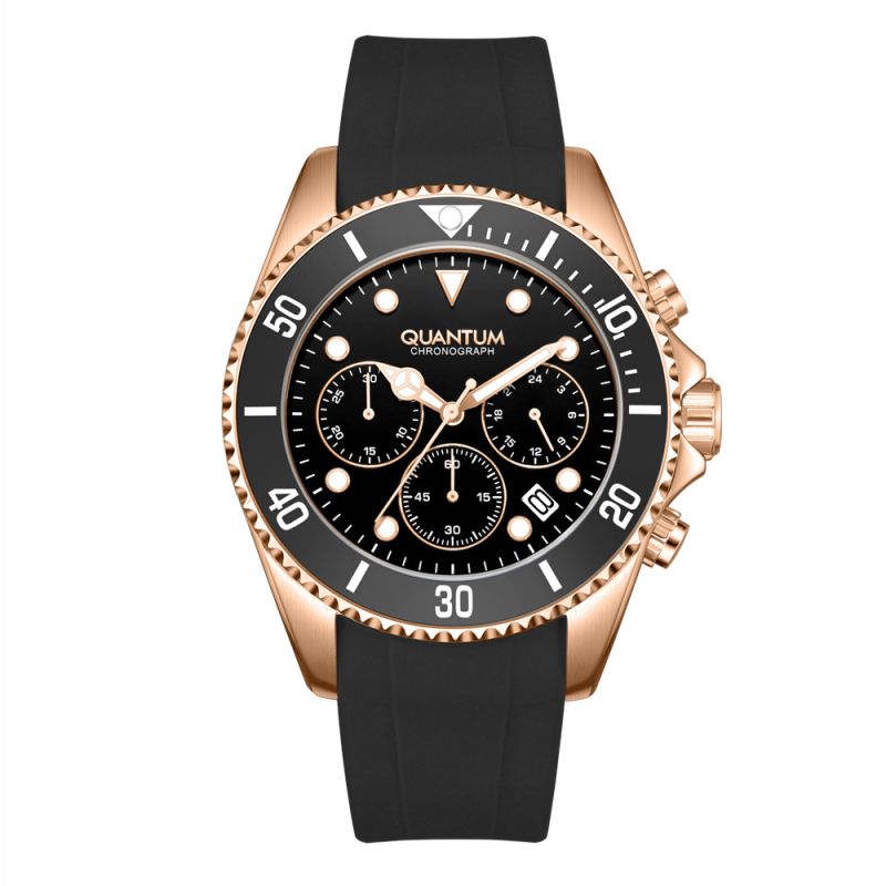 Страхотен модел мъжки часовник Quantum със спортно-ежедневен дизайн. Черен дисплей хронограф с детайли в цвят розово злато. Луминесцентно покритие върху стрелките и индексите. Стъкло минерал-кристал. Корпус изработен от неръждаема стомана. Силиконова каишка в черен цвят. Диаметър на корпуса 44 мм. Часовникът се задвижва от кварцов механизъм с калибър VR32. Водоустойчивост 10 ATM - позволява мокрене, къпане и плуване във водни басейни.