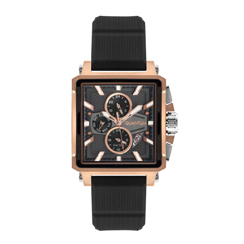 Мъжки часовник Quantum със спортно-ежедневен дизайн от колекцията Hunter. Моделът е с мултифункционален дисплей. Луминесцентно покритие върху стрелките и индексите. Стъкло минерал-кристал. Корпус от неръждаема стомана в комбинация със силиконова каишка. Задвижва се от кварцов механизъм с калибър JP15. Водоустойчивост 10 ATM - позволява мокрене, къпане и плуване във водни басейни.