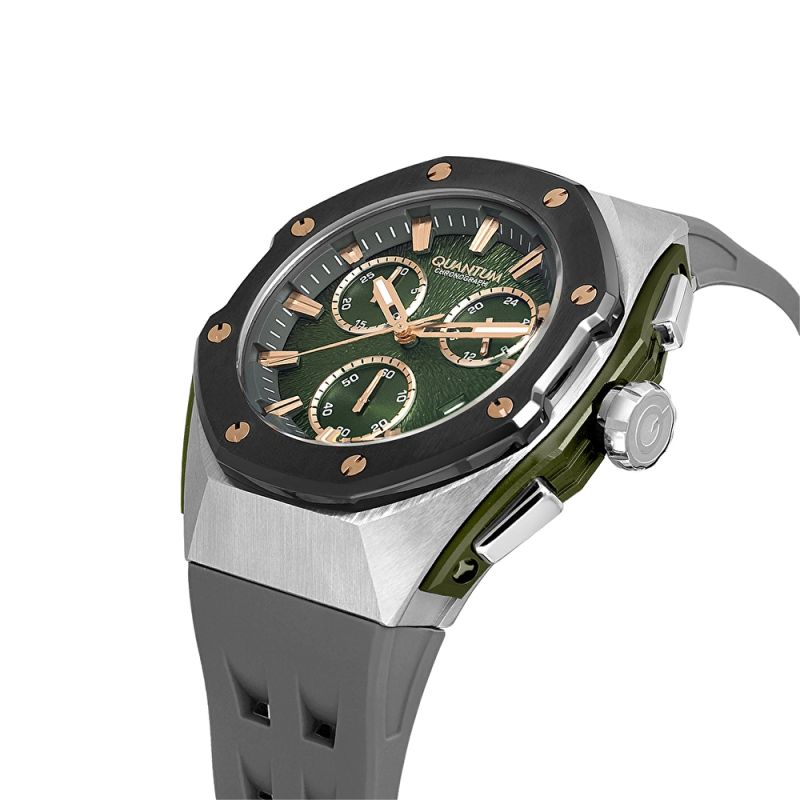 Мъжки часовник Quantum със спортен дизайн от колекцията Hunter. Дисплей хронограф в тъмнозелен цвят с детайли в цвят розово злато. Луминесцентно покритие върху стрелките. Стъкло минерал-кристал . Корпус от неръждаема стомана в комбинация със силиконова каишка. Задвижва се от кварцов механизъм с калибър VR34B12. Диаметър на корпуса 46 мм. Водоустойчивост 10 ATM - позволява мокрене, къпане и плуване във водни басейни.