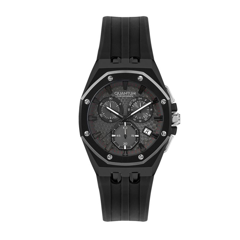 Мъжки часовник Quantum със спортно-ежедневен дизайн от колекцията Hunter. Дисплей тип хронограф в черен цвят. Стъкло минерал-кристал. Луминесцентно покритие върху стрелките. Корпус от неръждаема стомана в комбинация със силиконова каишка. Диаметър на корпуса 45 мм. Задвижва се от кварцов механизъм. Водоустойчивост 10 ATM - позволява мокрене, къпане и плуване във водни басейни.