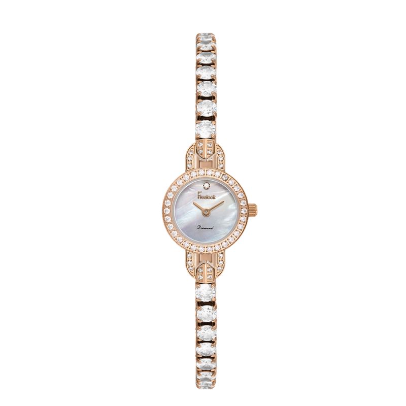 Изящен дамски часовник Freelook с блестящ дизайн от колекцията Charmant. Моделът е с декорация от кристали върху безела и верижката. Дисплеят е аналогов в седефен цвят с нежно диамантче на 12 часа. Стъклото е минерал-кристал. Корпусът и верижката са изработени от неръждаема стомана. Задвижва се от кварцов механизъм. Водоустойчивост 3 ATM - допускат се леки пръски, не се препоръчва обилно мокрене.