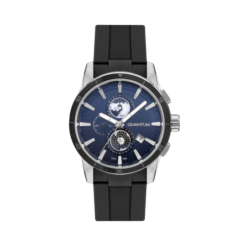 Мъжки часовник Quantum със спортен дизайн от колекцията Adrenaline. Корпус изработен от неръждаема стомана. Син мултифункционален дисплей със сребристи детайли и показатели за ден от седмицата, дата и двойно време. Луминесцентно покритие върху стрелките. Стъкло минерал-кристал с антирефлексно покритие. Черна силиконова каишка. Задвижва се от кварцов механизъм с калибър JP15. Диаметър на корпуса 47 мм. Водоустойчивост 10 ATM - позволява мокрене, къпане и плуване във водни басейни.