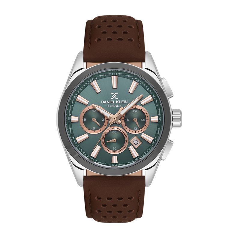 Спортно-елегантен мъжки часовник Daniel Klein от колекцията Exclusive. Моделът е с мултифункционален дисплей. Луминесцентно покритие върху стрелките и индексите. Стъкло минерал-кристал. Корпус изработен от метал. Каишка от естествена кожа в кафяв цвят. Диаметър на корпуса 42 мм. Часовникът се задвижва от кварцов механизъм. Водоустойчивост 5 ATM - допускат се леки пръски и взимане на душ, не се препоръчва обилно мокрене.
