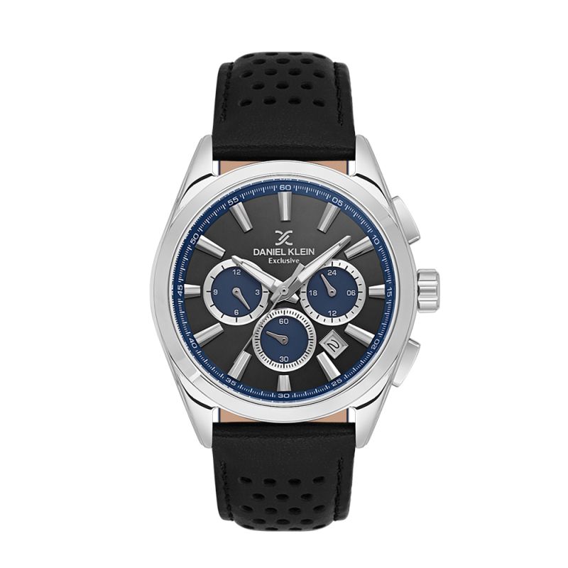 Спортно-елегантен мъжки часовник Daniel Klein от колекцията Exclusive. Моделът е с мултифункционален дисплей. Луминесцентно покритие върху стрелките и индексите. Стъкло минерал-кристал. Корпус изработен от метал. Каишка от естествена кожа в черен цвят. Диаметър на корпуса 42 мм. Часовникът се задвижва от кварцов механизъм. Водоустойчивост 5 ATM - допускат се леки пръски и взимане на душ, не се препоръчва обилно мокрене.