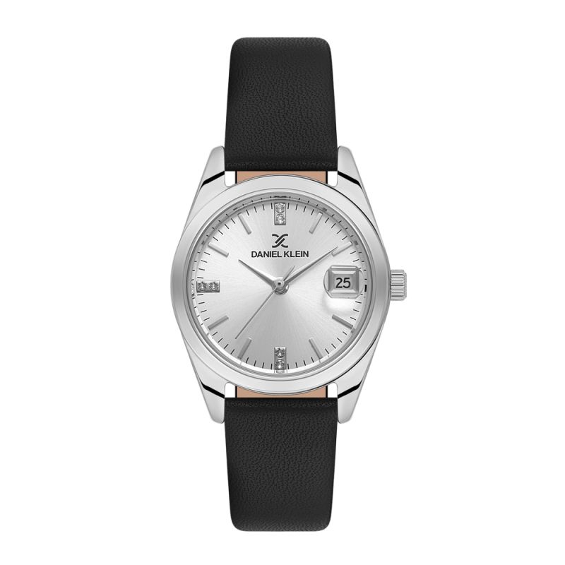 Дамски часовник Daniel Klein с класически дизайн от колекцията Premium. Аналогов дисплей с показател за дата и декорация от нежни кристали върху част от индексите . Стъкло минерал-кристал. Корпус изработен от метал. Черна каишка от естествена кожа. Диаметър на корпуса 28 мм. Задвижва се от кварцов механизъм. Водоустойчивост 3 ATM - допускат се леки пръски, не се препоръчва обилно мокрене.