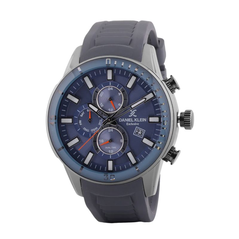 Страхотен модел мъжки часовник Daniel Klein със спортен дизайн от колекцията Exclusive. Мултифункционален дисплей с показатели за дата, ден от седмицата, двойно време и 24 часов формат. Луминесцентно покритие върху стрелките и индексите. Корпус изработен от метал. Силиконова каишка в сив цвят. Задвижва се от кварцов механизъм. Водоустойчивост 5 ATM - допускат се леки пръски и взимане на душ, не се препоръчва обилно мокрене.