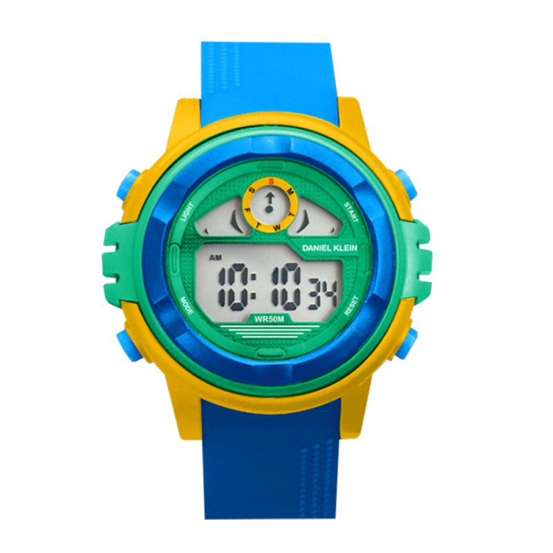 Детски часовник Daniel Klein с цветен дизайн. Моделът е с корпус и каишка изработено от полимер. Плексигласово стъкло. Дигитален дисплей. Часовникът има следните функции: показател за дата, ден от седмицата, 12/24 часов форма, аларма и осветяване на дисплея. Задвижва се от кварцов механизъм. Водоустойчивост 5 ATM - допускат се леки пръски и взимане на душ, не се препоръчва обилно мокрене.