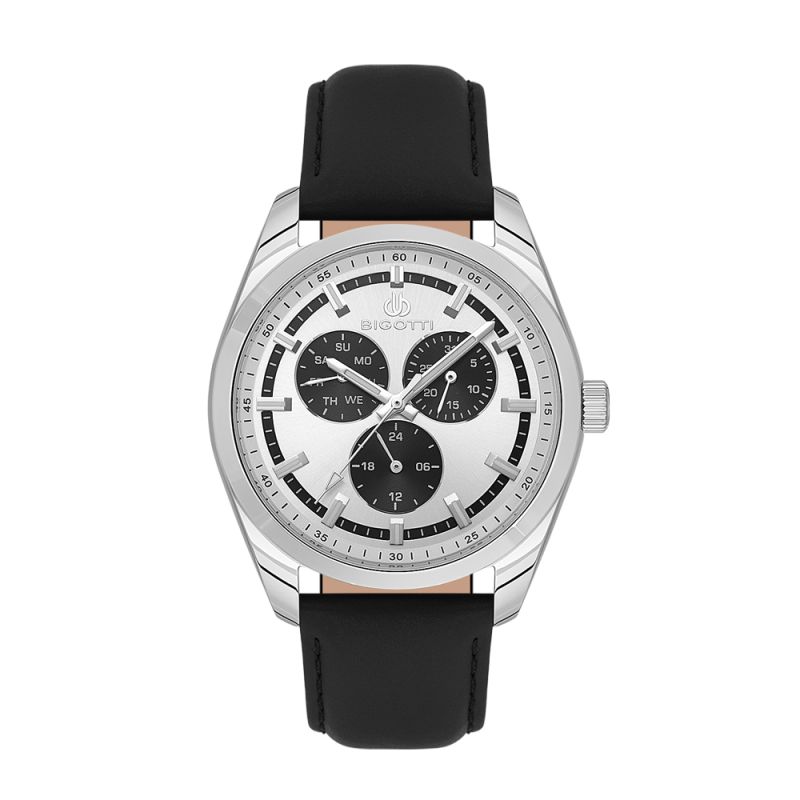 Мъжки часовник Bigotti със спортно-елегантен дизайн от колекцията Quotidiano. Сребрист мултифункционален дисплей с показател за ден от седмицата, дата и 24-часов формат. Луминесцентно покритие върху стрелките и индексите. Стъкло минерал-кристал. Моделът е с корпус от месинг и каишка от естествена кожа. Диаметър на корпуса 43 мм. Часовникът се задвижва от кварцов механизъм. Водоустойчивост 5 ATM - допускат се леки пръски и взимане на душ, не се препоръчва обилно мокрене.