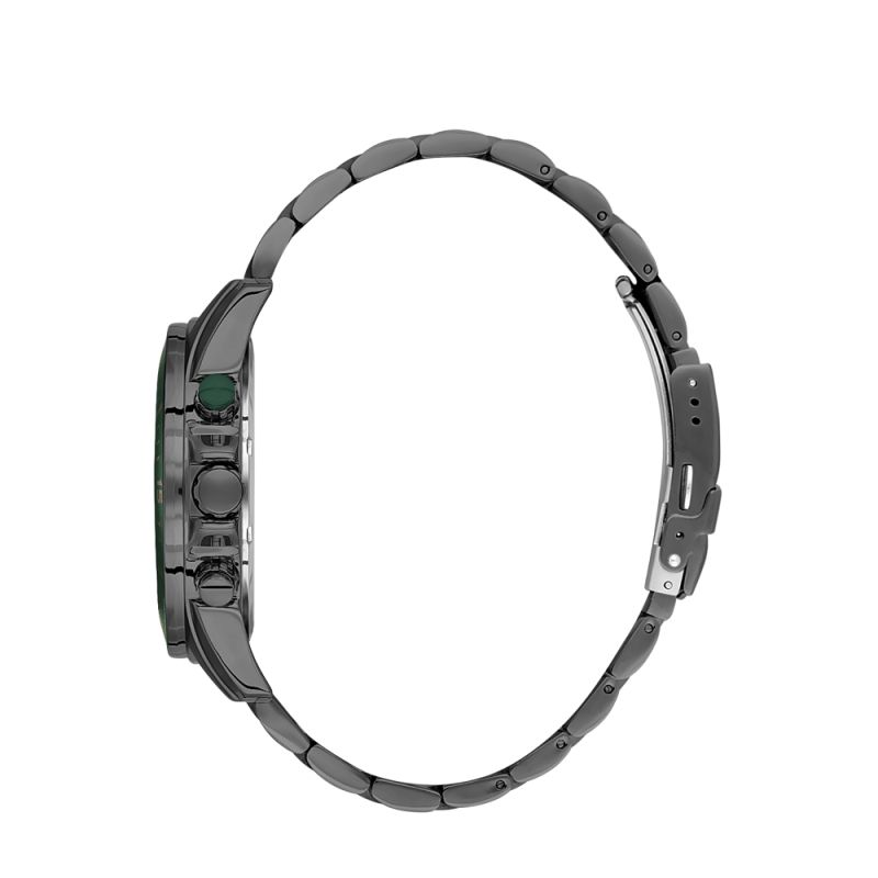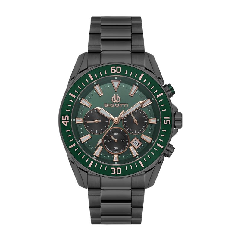 Спортно-елегантен мъжки часовник Bigotti от колекцията Raffinato. Тъмнозелен мултифункционален дисплей с детайли в цвят розово злато. Луминесцентно покритие върху стрелките и индексите. Стъкло минерал-кристал. Моделът е с корпус от месинг и верижка от неръждаема стомана. Диаметър на корпуса 45 мм. Часовникът се задвижва от кварцов механизъм. Водоустойчивост 5 ATM - допускат се леки пръски и взимане на душ, не се препоръчва обилно мокрене.