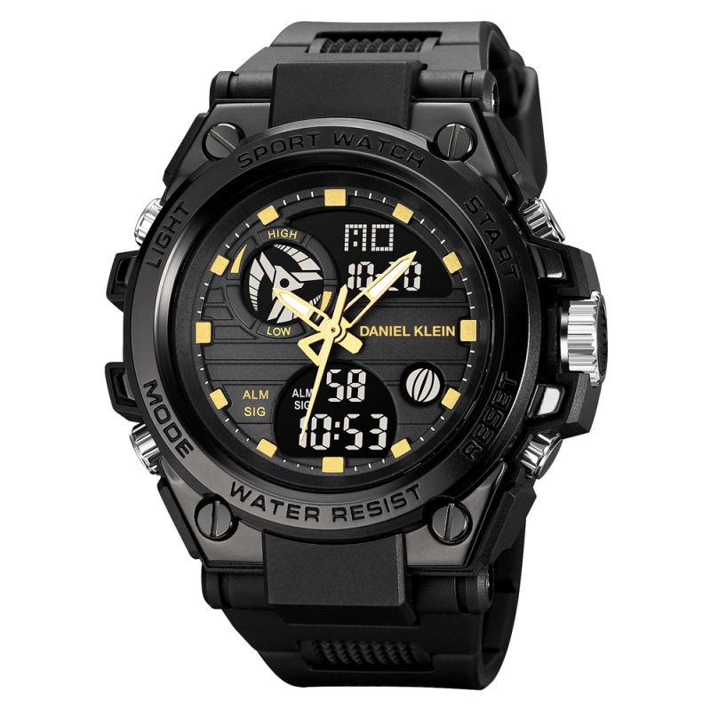 Мъжки часовник Daniel Klein със спортен дизайн от колекцията Digital. Дисплей комбинация от аналогов и дигитален. Плексигласово стъкло. Корпус изработен от полимер и метал. Черна каишка от полимер. Часовникът има следните функции: показател за дата и ден от седмицата, 12/24 часов формат, аларма и осветяване на дисплея. Задвижва се от кварцов механизъм. Водоустойчивост 5 ATM - допускат се леки пръски и взимане на душ, не се препоръчва обилно мокрене.