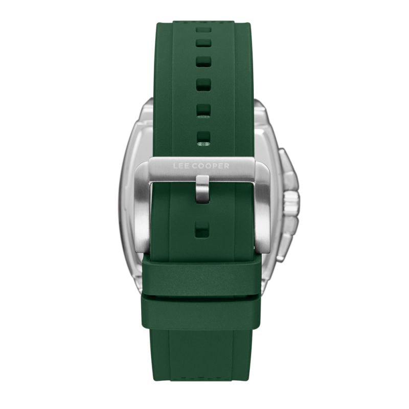 Мъжки часовник Lee Cooper със спорен дизайн от колекцията Classic Dual Time. Корпус изработен от супер метал - специална сплав, създадена от марката. Силиконова каишка. Тъмнозелен мултифункционален дисплей с показатели за ден, дата и двойно време. Стъкло минерал-кристал. Задвижва се от кварцов механизъм. Водоустойчивост 5 ATM - допускат се леки пръски и взимане на душ, не се препоръчва обилно мокрене.