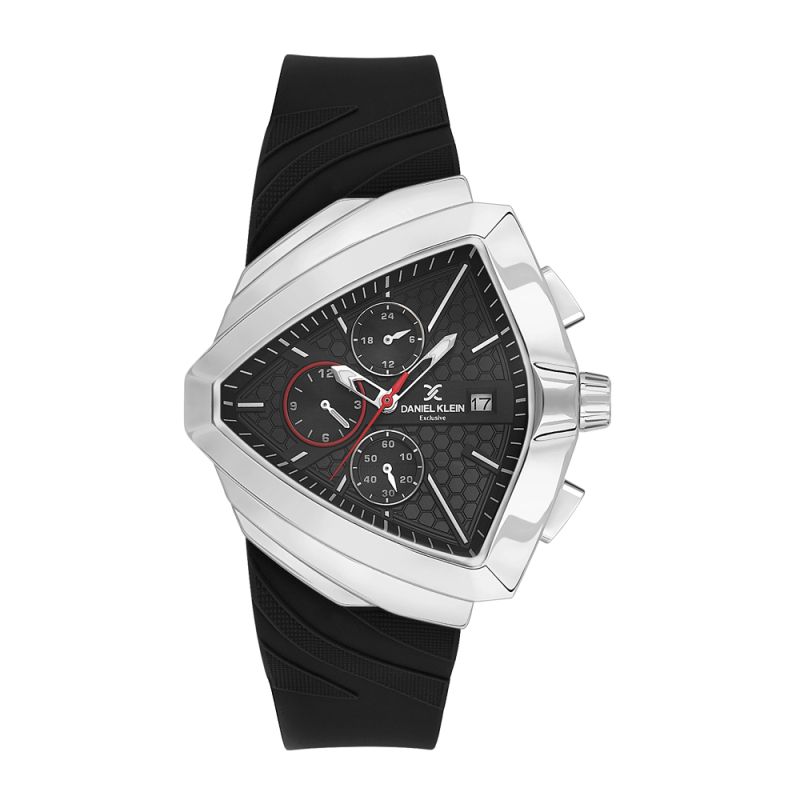 Впечатляващ мъжки часовник Daniel Klein с модерен дизайн от колекцията Exclusive. Мултифункционален дисплей с интересна триъгълна форма. Стъкло минерал-кристал. Моделът е с метален корпус. Черна силиконова каишка. Задвижва се от кварцов механизъм. Водоустойчивост 5 ATM - допускат се леки пръски и взимане на душ, не се препоръчва обилно мокрене.