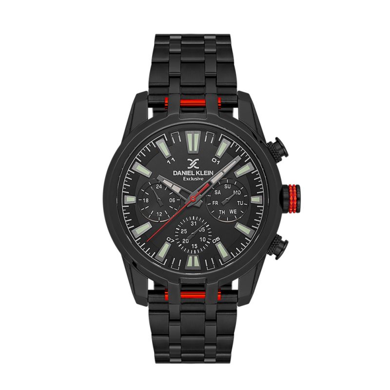 Мъжки часовник Daniel Klein със спортно-елегантен дизайн от колекцията Exclusive. Мултифункционален дисплей с показатели за дата, ден от седмицата и 24-часов формат. Луминесцентно покритие върху стрелките и индексите. Стъкло минерал-кристал. Метален корпус съчетан с верижка от неръждаема стомана. Диаметър на корпуса 44 мм. Часовникът се задвижва от кварцов механизъм. Водоустойчивост 5 ATM - допускат се леки пръски и взимане на душ, не се препоръчва обилно мокрене.
