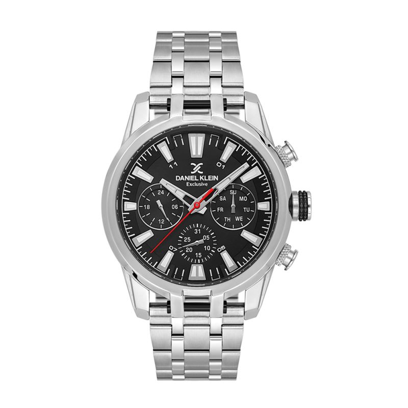 Мъжки часовник Daniel Klein със спортно-елегантен дизайн от колекцията Exclusive. Мултифункционален дисплей с показатели за дата, ден от седмицата и 24-часов формат. Луминесцентно покритие върху стрелките и индексите. Стъкло минерал-кристал. Метален корпус съчетан с верижка от неръждаема стомана. Диаметър на корпуса 44 мм. Часовникът се задвижва от кварцов механизъм. Водоустойчивост 5 ATM - допускат се леки пръски и взимане на душ, не се препоръчва обилно мокрене.