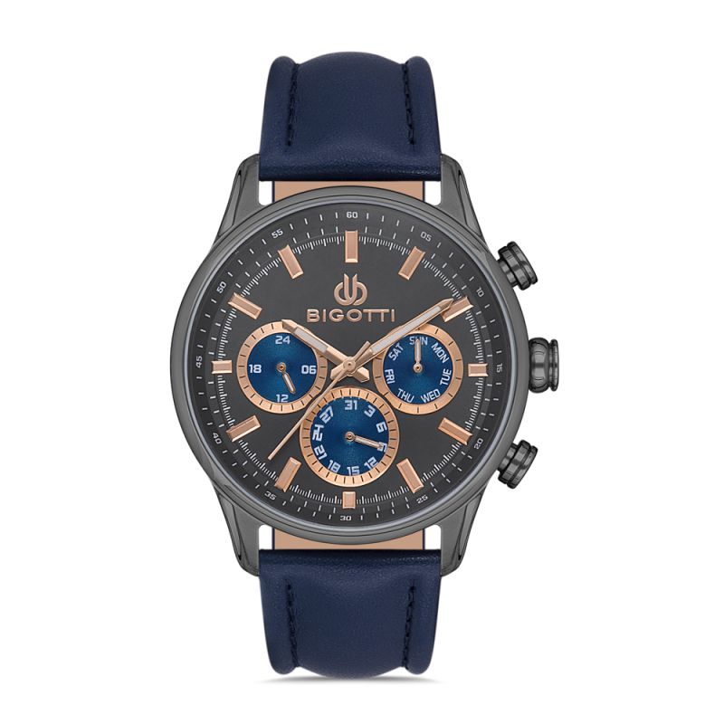 Мъжки часовник Bigotti със спортно-елегантен дизайн от колекцията Milano. Мултифункционален дисплей с показатели за дата, ден от седмицата и 24 часов формат. Стъкло минерал-кристал. Корпус изработен от месинг. Тъмносиня каишка от естествена кожа. Диаметър на корпуса 44 мм. Часовникът се задвижва от кварцов механизъм. Водоустойчивост 5 ATM - допускат се леки пръски и взимане на душ, не се препоръчва обилно мокрене.