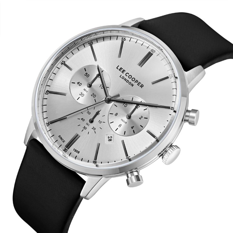 Мъжки часовник Lee Cooper с класически дизайн от колекцията Classic Chronograph. Корпус изработен от супер метал - специална сплав, създадена от марката. Диаметър на корпуса 45мм. Черна каишка от естествена кожа. Сребрист дисплей хронограф. Стъкло минерал-кристал. Задвижва се от кварцов механизъм. Водоустойчивост 3 ATM - допускат се леки пръски, не се препоръчва обилно мокрене.