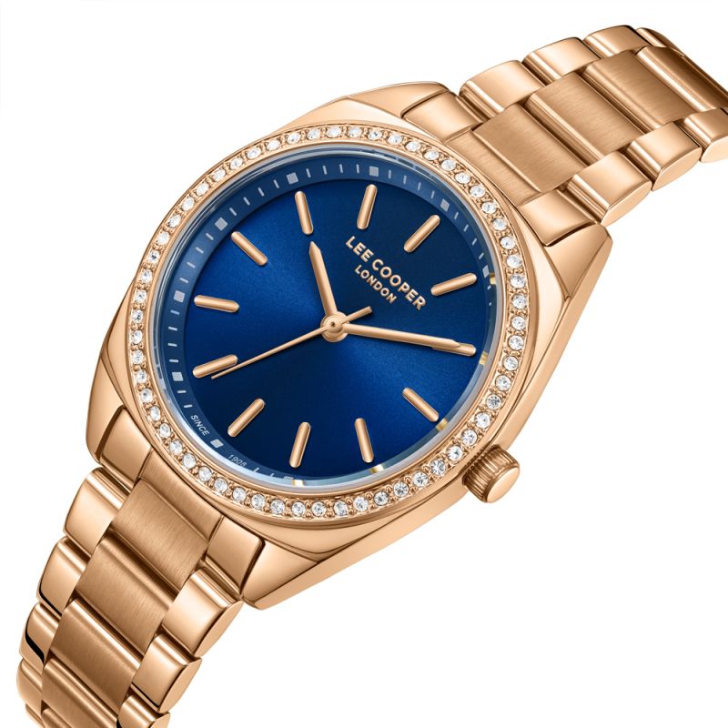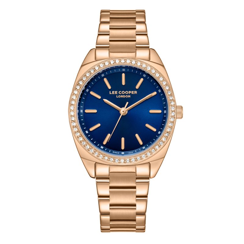 Дамски часовник Lee Cooper с модерна визия от колекцията Elegance. Тъмносин аналогов дисплей със стрелки и индекси в цвят розово злато. Безел с декорация от бляскави кристали. Стъкло минерал-кристал. Корпус изработен от супер метал - специална сплав, създадена от марката. Диаметър на корпуса 32 мм. Верижка от неръждаема стомана. Задвижва се от кварцов механизъм. Водоустойчивост 3 ATM - допускат се леки пръски, не се препоръчва обилно мокрене.