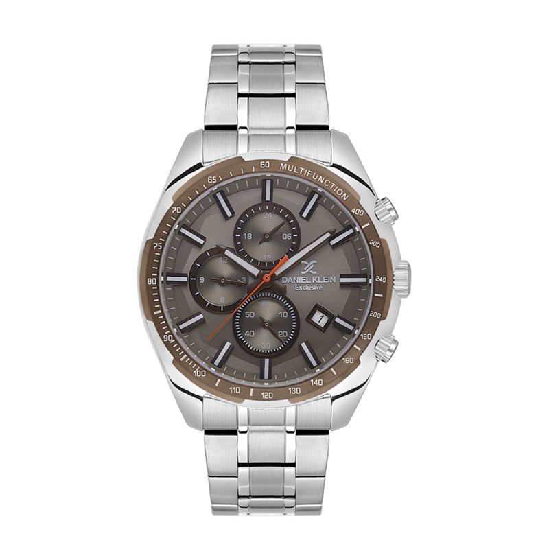 Мъжки часовник Daniel Klein със спортно-ежедневен дизайн от колекцията Exclusive. Мултифункционален дисплей в сив цвят. Луминесцентно покритие върху стрелките и индексите. Стъкло минерал-кристал. Часовникът е с метален корпус и верижка от неръждаема стомана. Здвижва се от кварцов механизъм. Водоустойчивост 5 ATM - допускат се леки пръски и взимане на душ, не се препоръчва обилно мокрене.