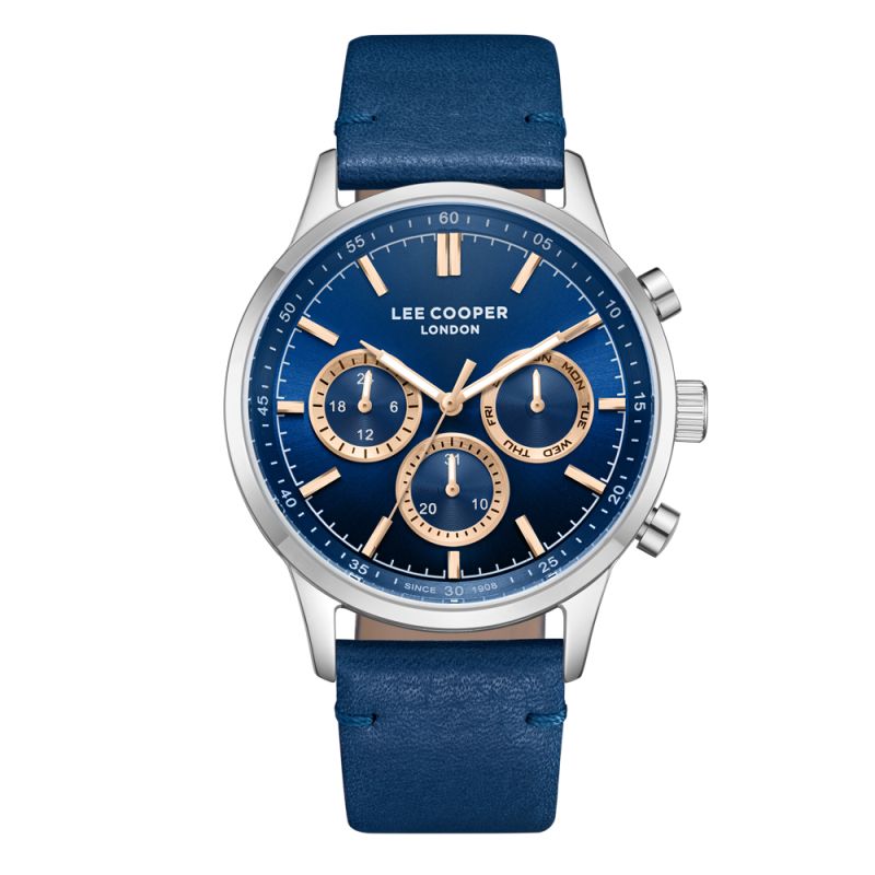 Спортно-елегантен мъжки часовник Lee Cooper от колекцията Classic Multifunction. Тъмносин мултифункционален дисплей с детайли в цвят розово злато. Луминесцентно покритие върху стрелките. Стъкло минерал-кристал. Корпус изработен от супер метал - специална сплав, създадена от марката. Каишка от естествена кожа. Задвижва се от кварцов механизъм калибър VX9JE1. Водоустойчивост 3 ATM - допускат се леки пръски, не се препоръчва обилно мокрене.