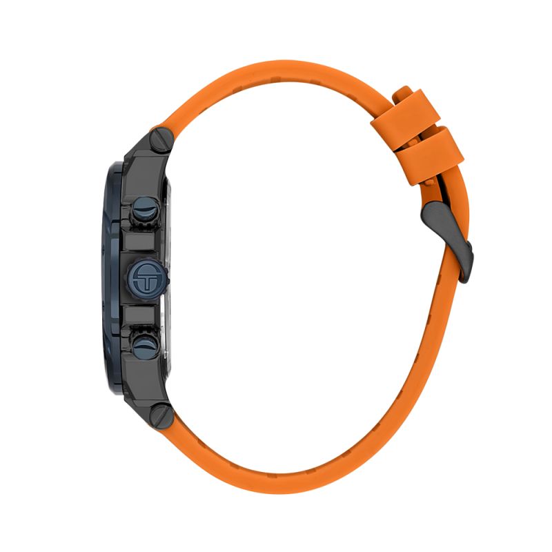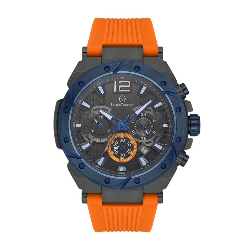Страхотен модел мъжки часовник Sergio Tacchini със спортна визия от колекцията Heritech. Корпус от неръждаема стомана съчетан със силиконова каишка. Мултифункционален дисплей с впечатляващ дизайн. Луминесцентно покритие върху стрелките и индексите. Стъкло минерал-кристал. Диаметър на корпуса 46 мм.Часовникът се задвижва от кварцов механизъм. Водоустойчивост 10 ATM - позволява мокрене, къпане и плуване във водни басейни.