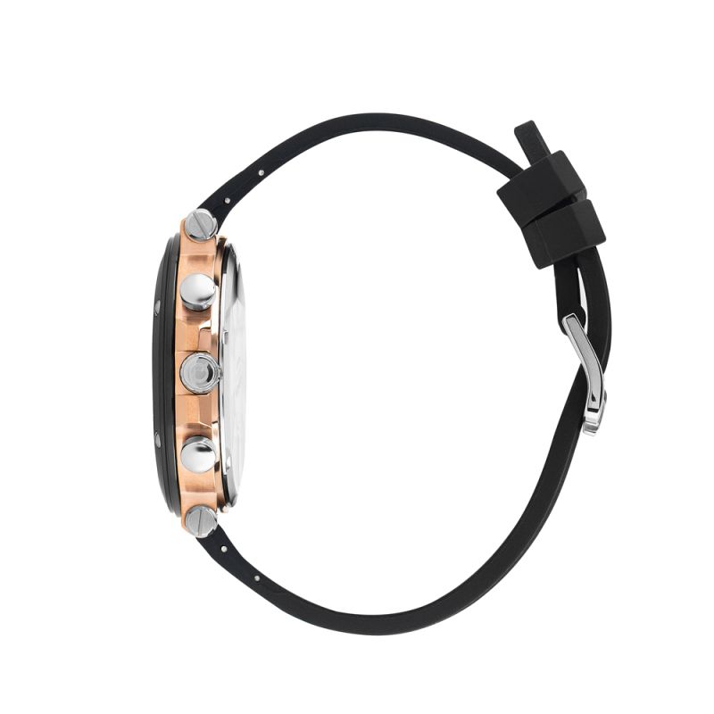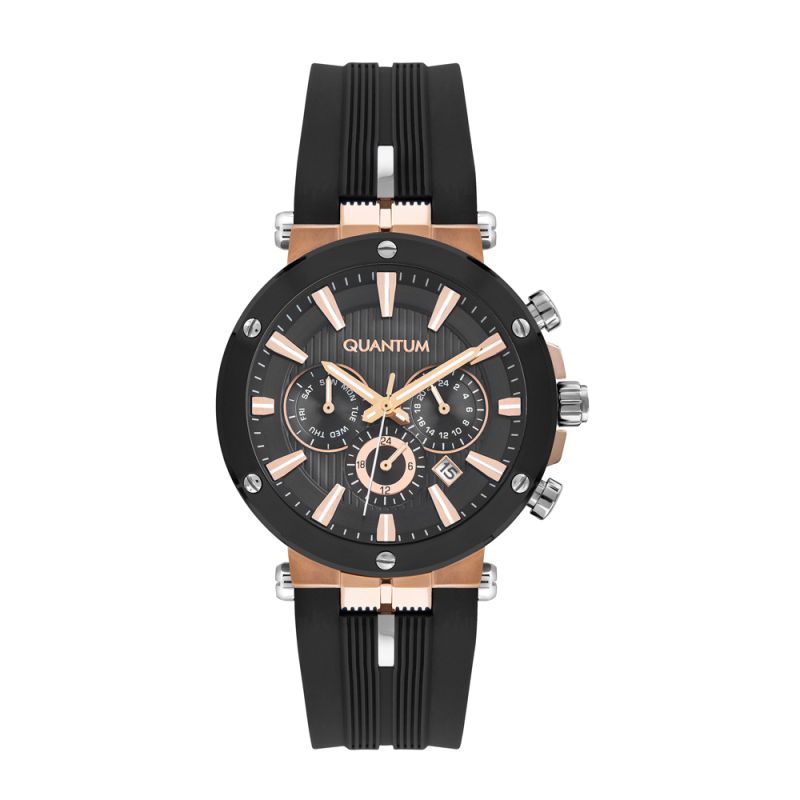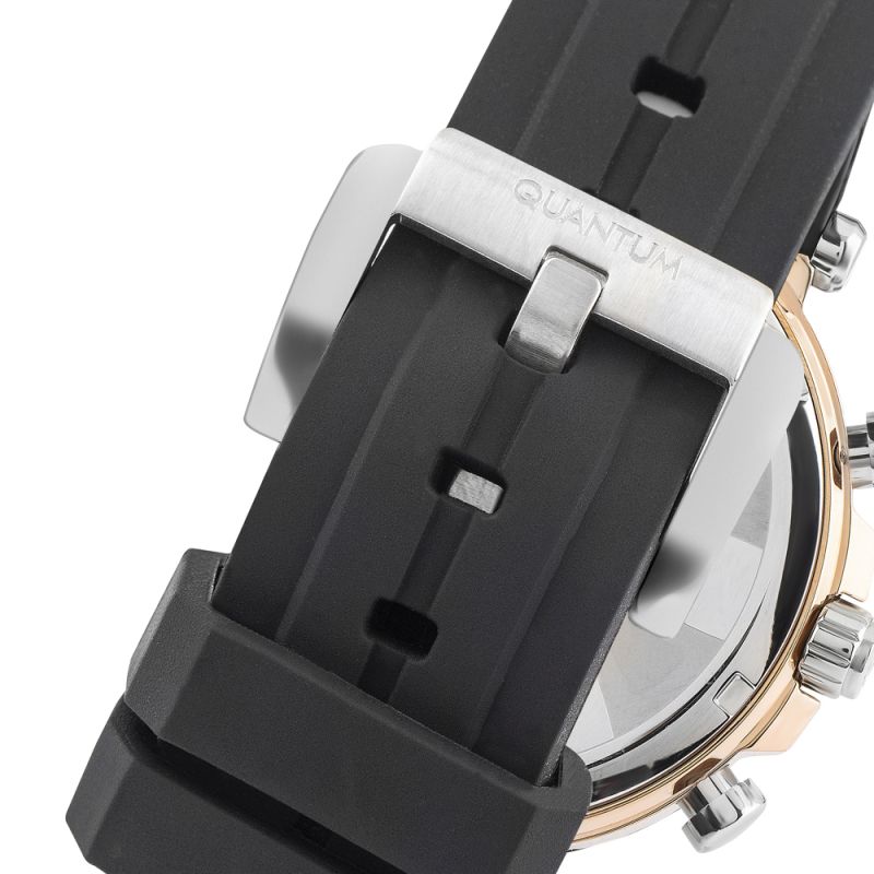 Мъжки часовник Quantum със спортен дизайн от колекцията Powertech. Черен мултифункционален дисплей с детайли в цвят розово злато. Стъкло минерал-кристал с антирефлексно покритие. Корпус от неръждаема стомана съчетан със силиконова каишка. Часовникът се задвижва от кварцов механизъм. Водоустойчивост 10 ATM - позволява мокрене, къпане и плуване във водни басейни.
