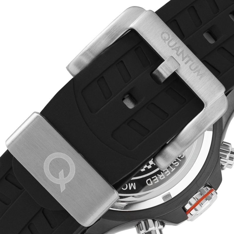 Мъжки часовник Quantum със спортен дизайн от колекцията Hunter. Черен дисплей хронограф със сребристи детайли. Луминесцентно покритие върху стрелките и индексите. Стъкло минерал-кристал с антирефлексно покритие. Корпус изработен от неръждаема стомана. Черна силиконова каишка със сребристи акценти. Часовникът се задвижва от кварцов механизъм с калибър VR34A. Водоустойчивост 10 ATM - позволява мокрене, къпане и плуване във водни басейни.