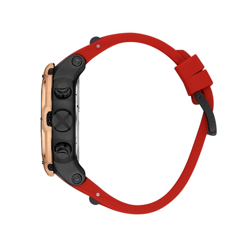 Мъжки часовник Quantum от колекцията Hunter. Черен дисплей хронограф с детайли в цвят розово злато. Луминесцентно покритие върху стрелките и индексите. Стъкло минерал-кристал с антирефлексно покритие. Корпус изработен от неръждаема стомана. Червена силиконова каишка с черни акценти. Часовникът се задвижва от кварцов механизъм с калибър VR34. Водоустойчивост 10 ATM - позволява мокрене, къпане и плуване във водни басейни.