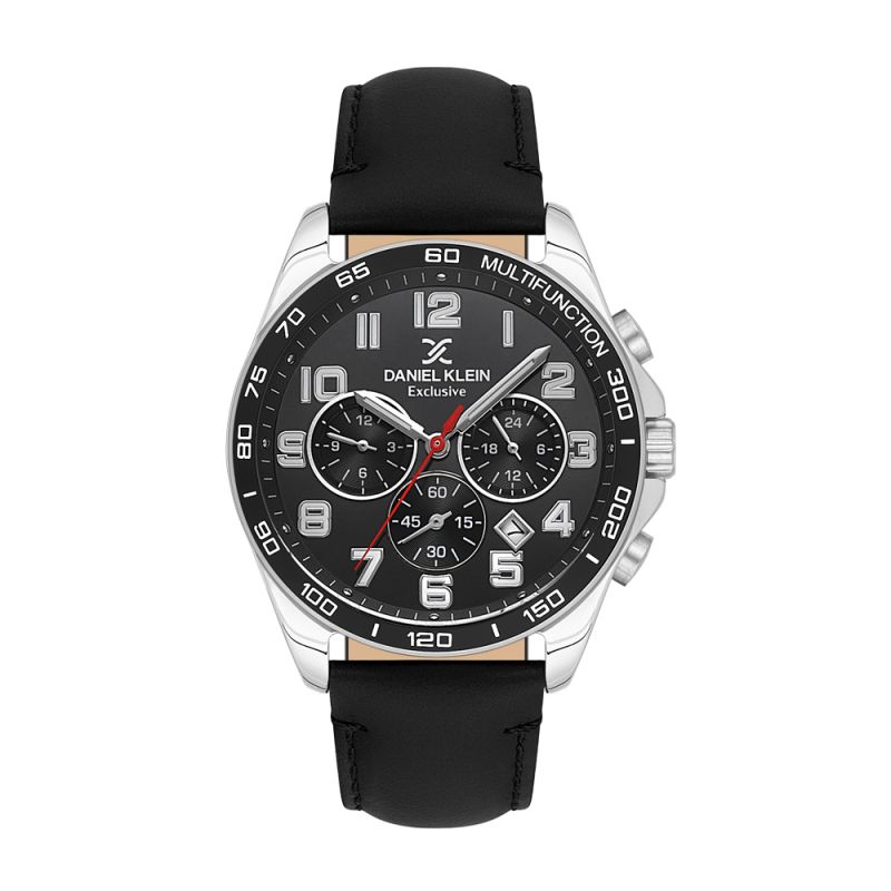Страхотен модел мъжки часовник Daniel Klein със спортно-елегантен дизайн от колекцията Exclusive. Черен милтифункционален дисплей със сребристи детайли. Луминесцентно покритие върху стрелките и цифрите. Стъкло минерал-кристал. Диаметър на корпуса 43 мм. Метален корпус съчетан с каишка от естествена кожа. Часовникът се задвижва от кварцов механизъм. Водоустойчивост 5 ATM - допускат се леки пръски и взимане на душ, не се препоръчва обилно мокрене.