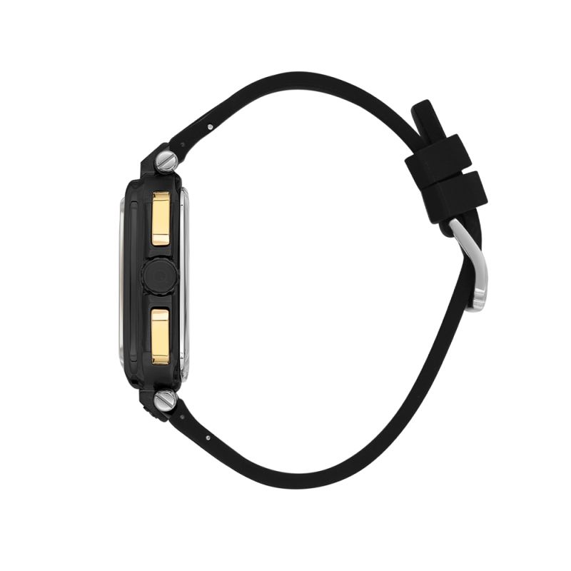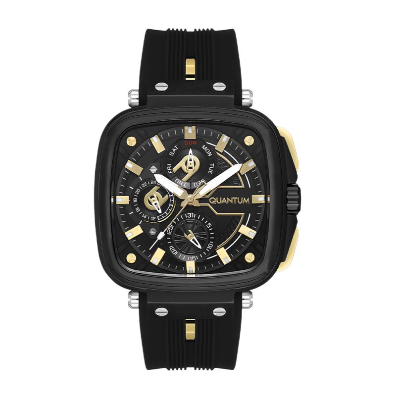 Мъжки часовник Quantum със спортно-ежедневен дизайн от колекцията Powertech. Мултифункционален дисплей в черен цвят със златисти детайли. Луминесцентно покритие на стрелките и индексите. Стъкло минерал-кристал с антирефлексно покритие. Корпус от неръждаема стомана. Черна силиконова каишка. Задвижва се от кварцов механизъм с калибър VX9NE. Водоустойчивост 10 ATM - позволява мокрене, къпане и плуване във водни басейни.