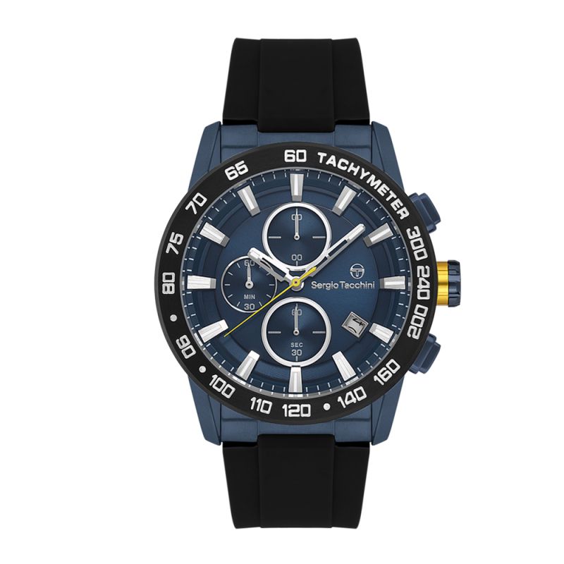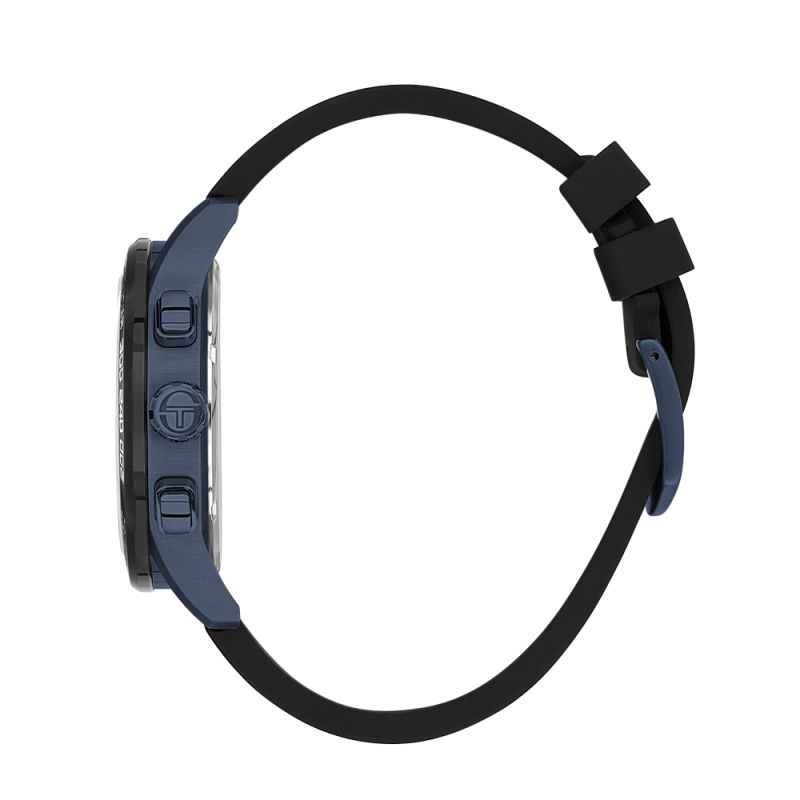 Мъжки часовник Sergio Tacchini със спортен дизайн от колекцията Archivio. Моделът е с корпус от неръждаема стомана и силиконова каишка. Дисплеят е хронограф в тъмносин цвят. Стъклото е минерал-кристал. Диаметър на корпуса 45 мм. Задвижва се от кварцов механизъм. Водоустойчивост 5 ATM - допускат се леки пръски и взимане на душ, не се препоръчва обилно мокрене.