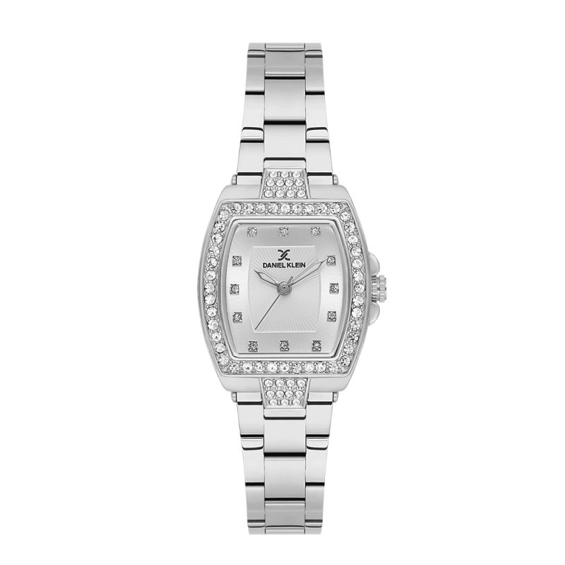 Изящен дамски часовник Daniel Klein със стилна визия от колекцията Premium. Аналогов дисплей в сребрист цвят със семпъл дизайн. Декорация от нежни кристали по индексите, безела и част от верижката. Стъкло минерал-кристал. Корпус изработен от метал. Верижка от неръждаема стомана. Часовникът се задвижва от кварцов механизъм. Водоустойчивост 3 ATM - допускат се леки пръски, не се препоръчва обилно мокрене.
