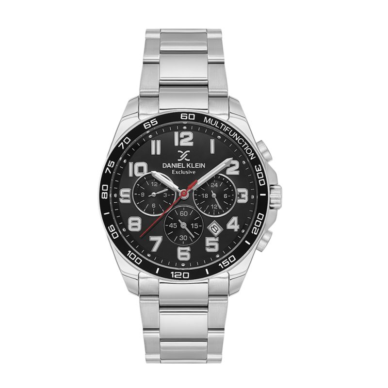 Страхотен модел мъжки часовник Daniel Klein със спортно-ежедневен дизайн от колекцията Exclusive. Черен милтифункционален дисплей със сребристи детайли. Луминесцентно покритие върху стрелките и цифрите. Стъкло минерал-кристал. Диаметър на корпуса 43 мм. Метален корпус съчетан с верижка от неръждаема стомана. Часовникът се задвижва от кварцов механизъм. Водоустойчивост 5 ATM - допускат се леки пръски и взимане на душ, не се препоръчва обилно мокрене.