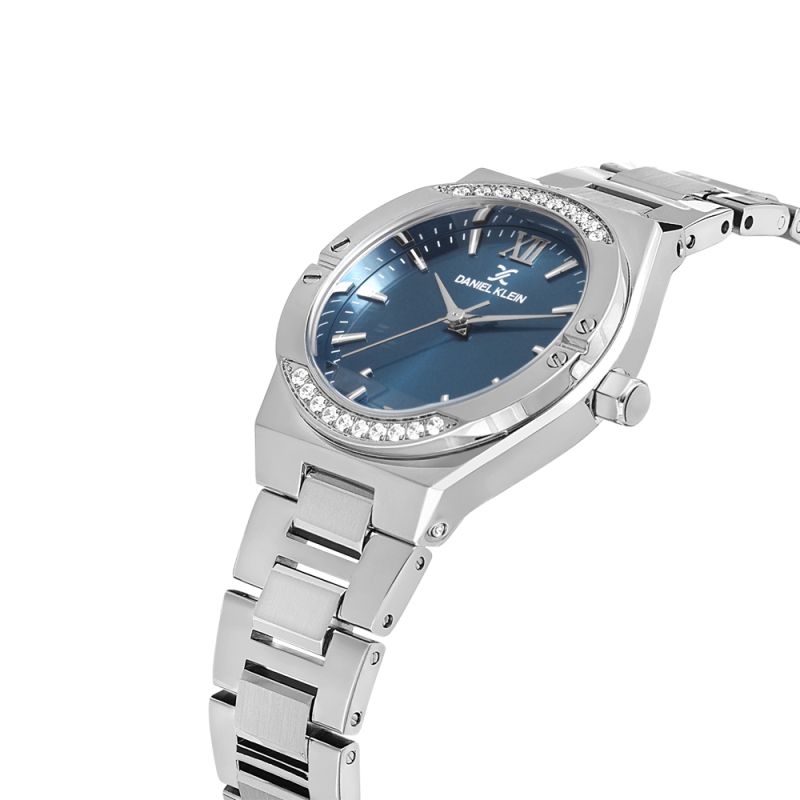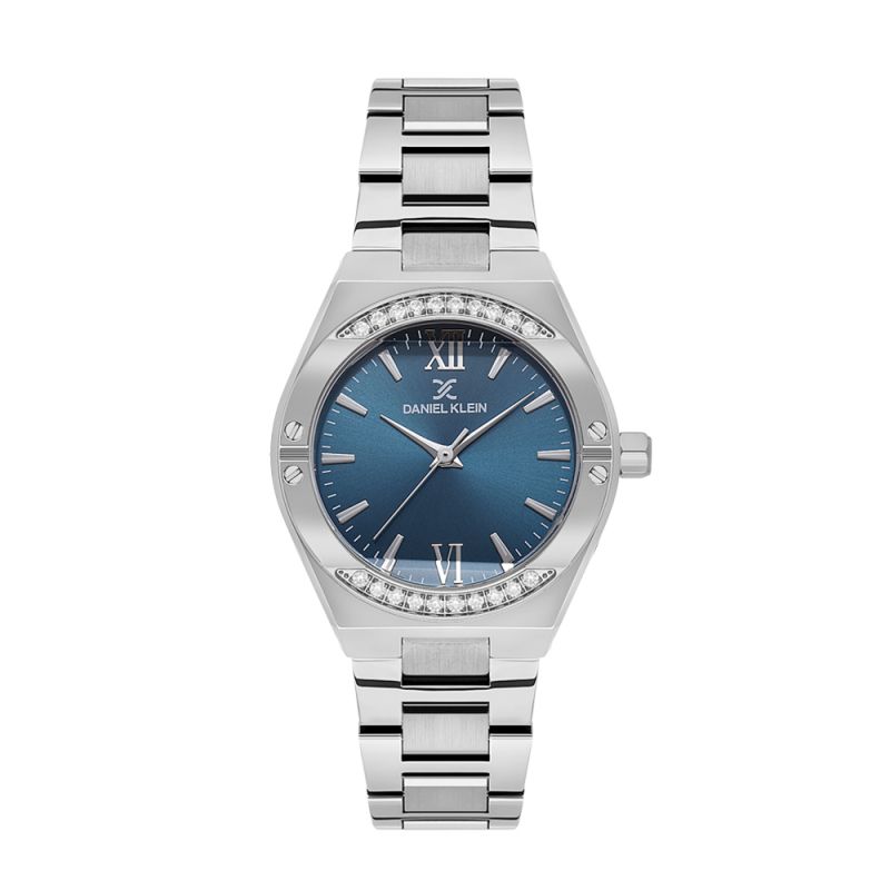Красив дамски часовник Daniel Klein с модерна визия от колекцията Premium. Тъмносин аналогов дисплей със сребристи детайли. Декорация от бляскави кристали. Стъкло минерал-кристал. Корпус изработен от метал. Верижка от неръждаема стомана. Диаметър на корпуса 32 мм. Часовникът се задвижва от кварцов механизъм. Водоустойчивост 3 ATM - допускат се леки пръски, не се препоръчва обилно мокрене.