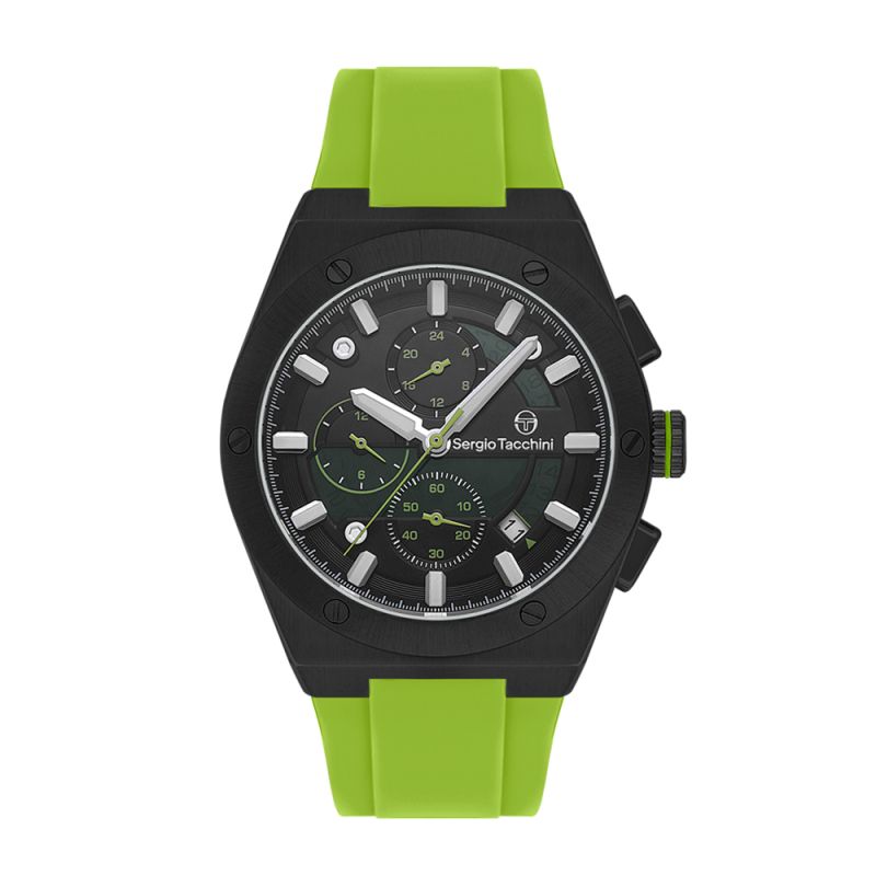 Мъжки часовник Sergio Tacchini със спортно-ежедневен дизайн от колекцията Archivio. Моделът е с мултифункционален дисплей и стъкло минерал-кристал. Корпус изработен от неръждаема стомана. Светлозелена силиконова каишка. Диаметър на корпуса 44 мм. Задвижва се от кварцов механизъм. Водоустойчивост 5 ATM - допускат се леки пръски и взимане на душ, не се препоръчва обилно мокрене.