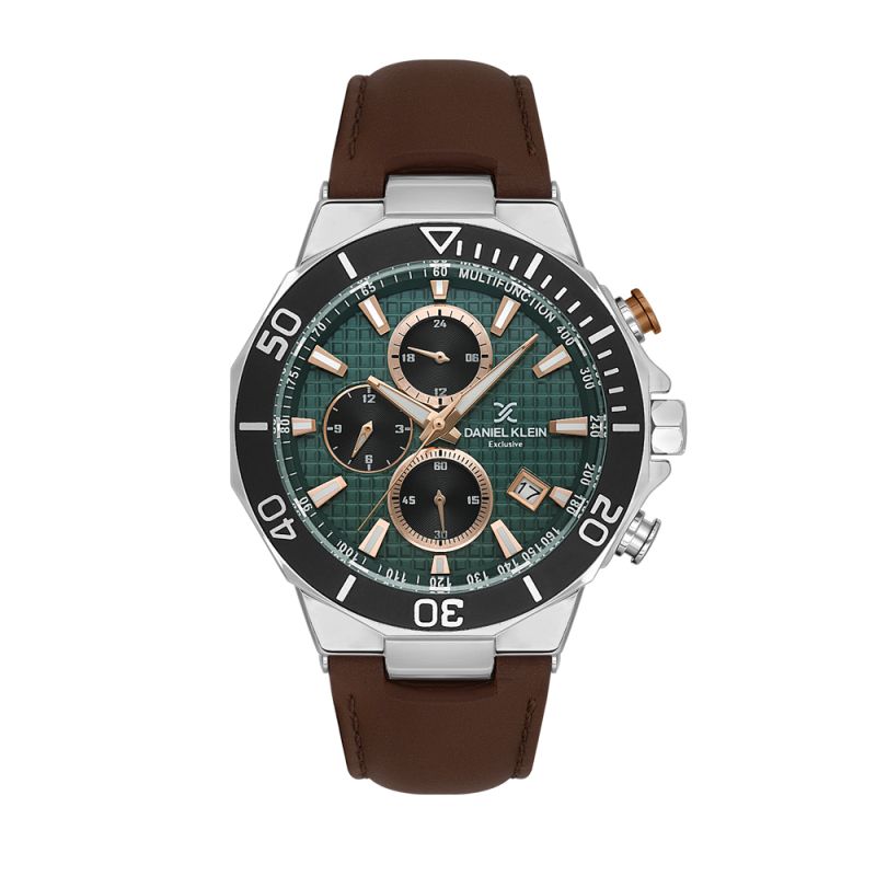 Спортно-елегантен мъжки часовник Daniel Klein от колекцията Exclusive. Моделът е с мултифункционален дисплей и стъкло минерал-кристал. Луминесцентно покритие върху стрелките и индексите. Диаметър на корпуса 44 мм. Метален корпус в комбинация с каишка от естествена кожа. Задвижва се от кварцов механизъм. Водоустойчивост 5 ATM - допускат се леки пръски и взимане на душ, не се препоръчва обилно мокрене.