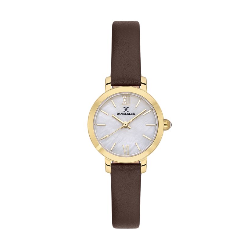 Дамски часовник Daniel Klein със стилен дизайн от колекцията Premium. Седефен аналогов дисплей със стрелки и индекси в цвят злато. Стъкло минерал-кристал. Корпус изработен от метал. Тъмнокафява каишка от естествена кожа. Диаметър на корпуса 26 мм. Часовникът се задвижва от кварцов механизъм. Водоустойчивост 3 ATM - допускат се леки пръски, не се препоръчва обилно мокрене.