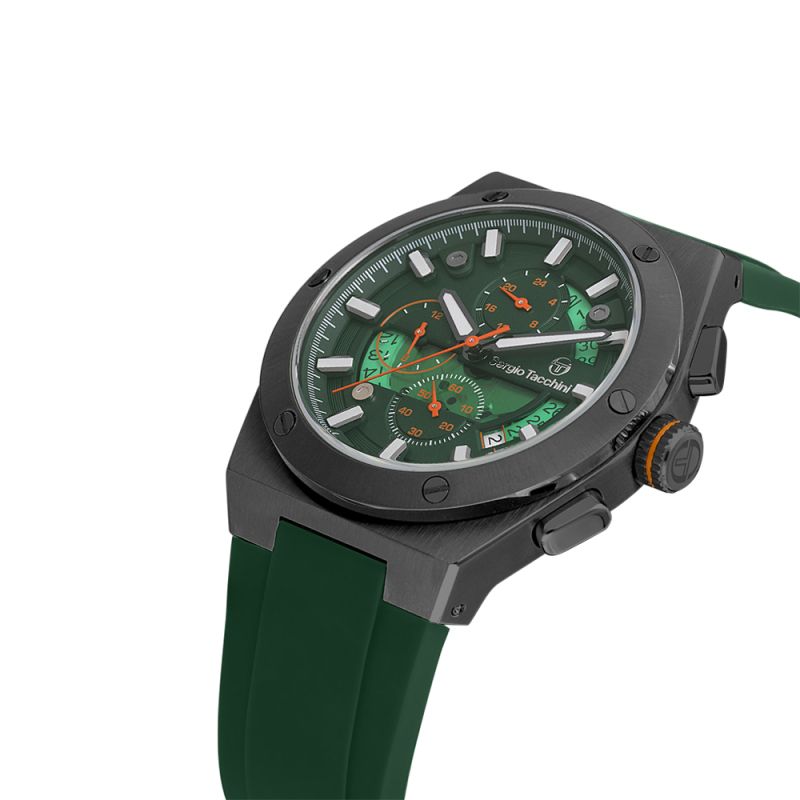 Мъжки часовник Sergio Tacchini със спортно-ежедневен дизайн от колекцията Archivio. Моделът е с мултифункционален дисплей и стъкло минерал-кристал. Корпус изработен от неръждаема стомана. Тъмнозелена силиконова каишка. Диаметър на корпуса 44 мм. Задвижва се от кварцов механизъм. Водоустойчивост 5 ATM - допускат се леки пръски и взимане на душ, не се препоръчва обилно мокрене.
