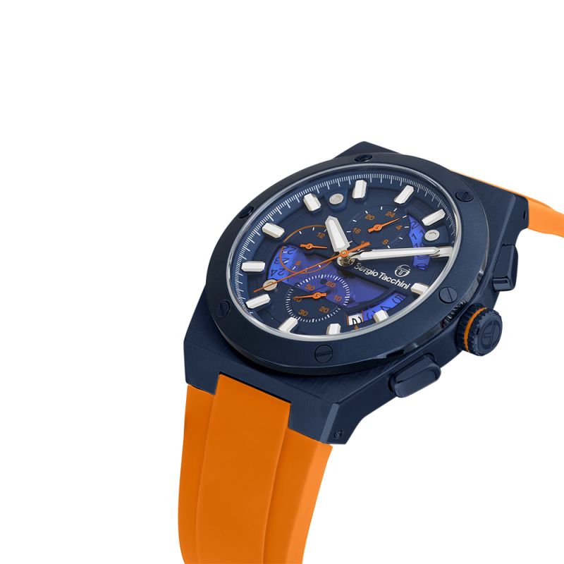 Мъжки часовник Sergio Tacchini с модерен спортен дизайн от колекцията Archivio. Моделът е с мултифункционален дисплей и стъкло минерал-кристал. Корпус изработен от неръждаема стомана.Оранжева силиконова каишка. Диаметър на корпуса 44 мм. Задвижва се от кварцов механизъм. Водоустойчивост 5 ATM - допускат се леки пръски и взимане на душ, не се препоръчва обилно мокрене.