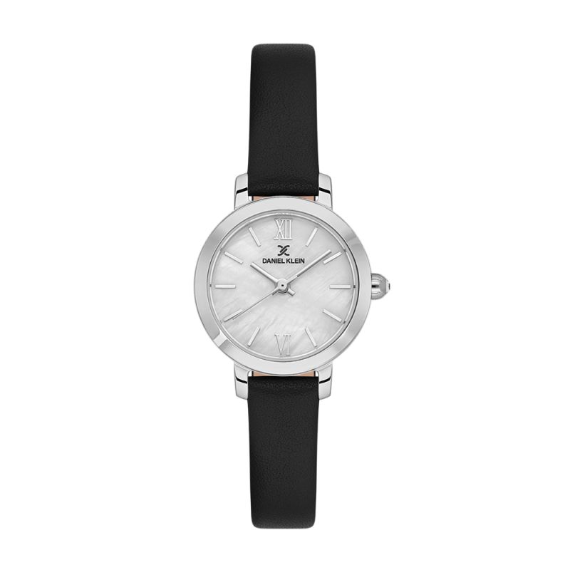 Дамски часовник Daniel Klein със стилен дизайн от колекцията Premium. Седефен аналогов дисплей със сребристи стрелки и индекси. Стъкло минерал-кристал. Корпус изработен от метал. Каишка от естествена кожа в черен цвят. Диаметър на корпуса 26 мм. Часовникът се задвижва от кварцов механизъм. Водоустойчивост 3 ATM - допускат се леки пръски, не се препоръчва обилно мокрене.