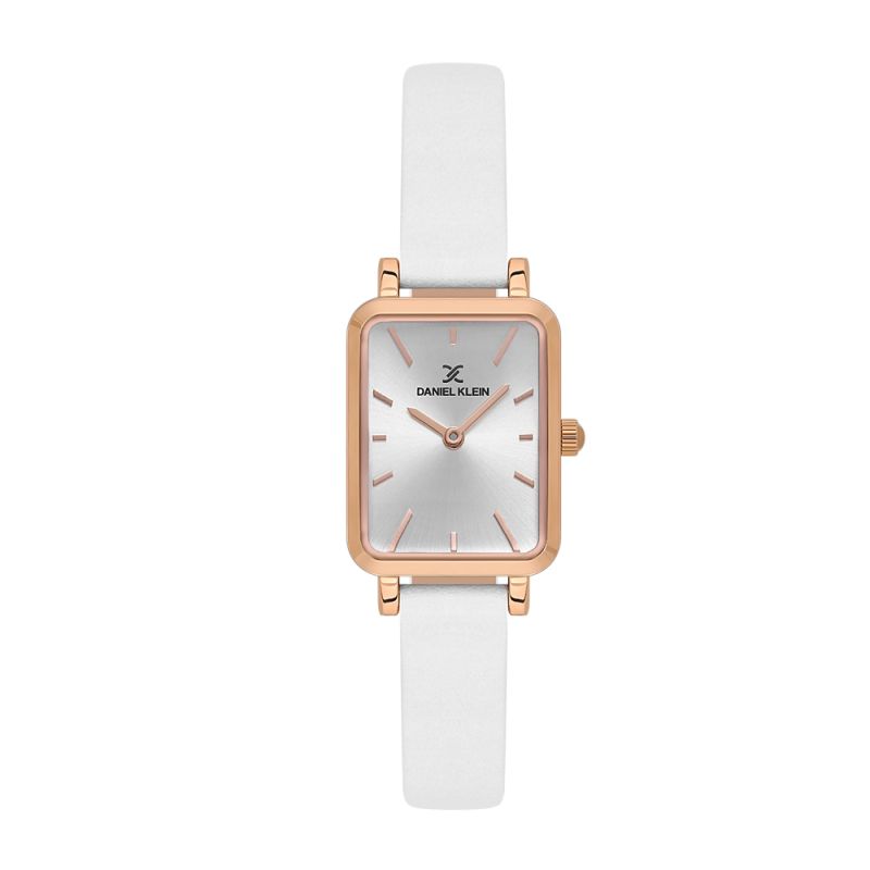 Дамски часовник Daniel Klein със стилна визия от колекцията Premium. Сребрист аналгов дисплей със стрелки и индекси в цвят розово злато. Корпус изработен от метал. Бяла каишка от естествена кожа. Задвижва се от кварцов механизъм. Водоустойчивост 3 ATM - допускат се леки пръски, не се препоръчва обилно мокрене.
